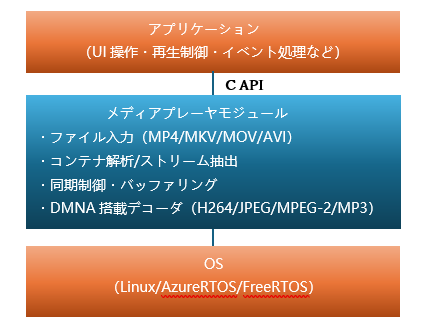 - 軽量で組込みやすいモジュール構成 メディア再生に必要なコア機能を最適化し、組込み向けに軽量化しています。 独自形式のシンプルなC APIにより、既存システムへ容易に実装できます。